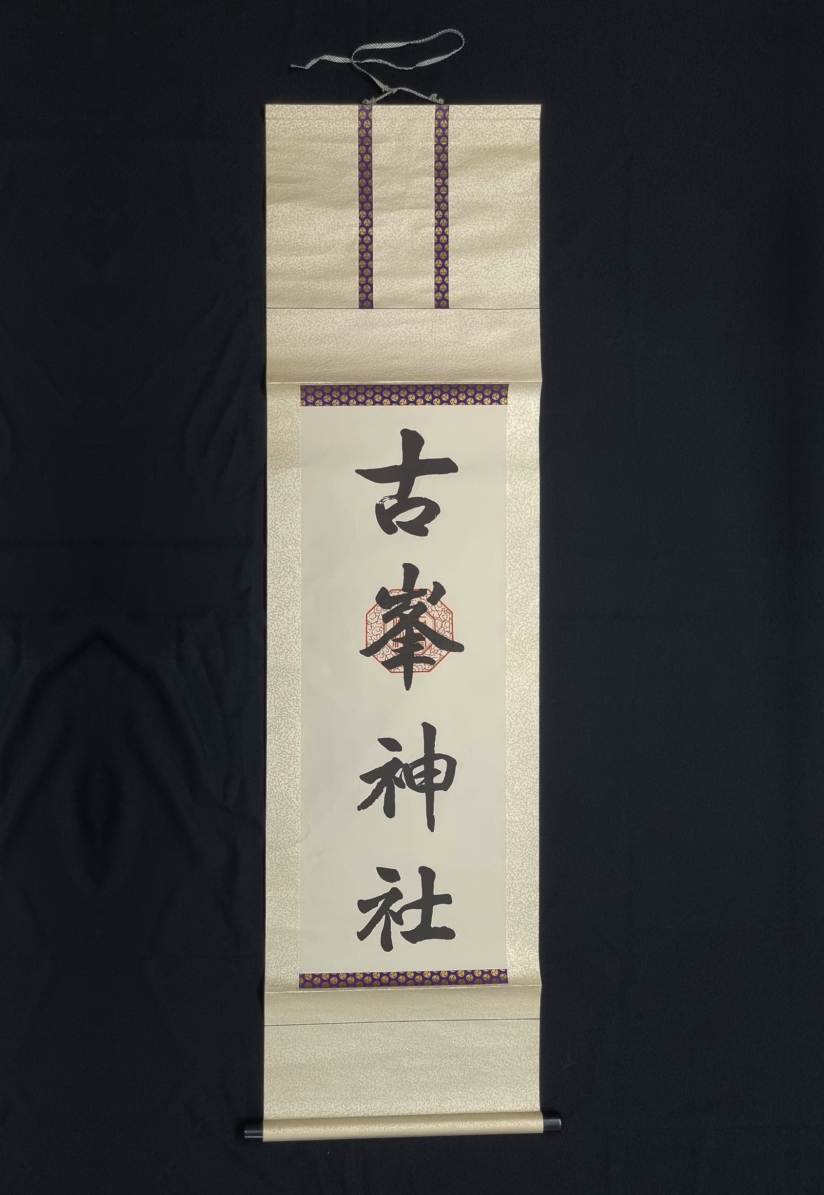 Deze hangende rol draagt de kalligrafie "古峯神社" (Furumine Jinja), de naam van het shintoheiligdom, in vette zwarte penseelstreken en draagt het officiële rode zegel (shuin) van de tempel. Zulke rollen worden traditioneel thuis opgehangen om bescherming, voorspoed en spirituele zegeningen te ontvangen.
